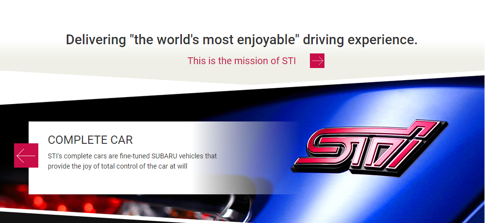 Nearby, we see text which says in black, "Delivering "the world's most enjoyable" driving experience." Just below that, in cherry blossom, it says "This is the mission of STI" This is written in yet a third shade of the signature STI color: RGB 200, 14, 71 or #C80E47.